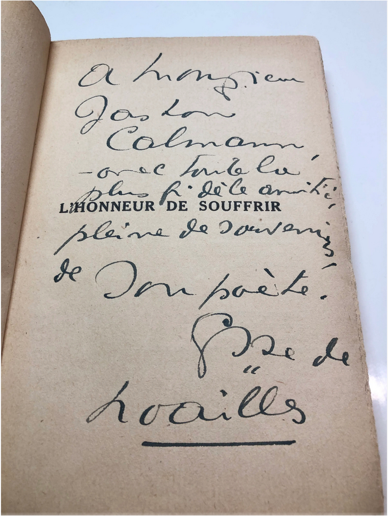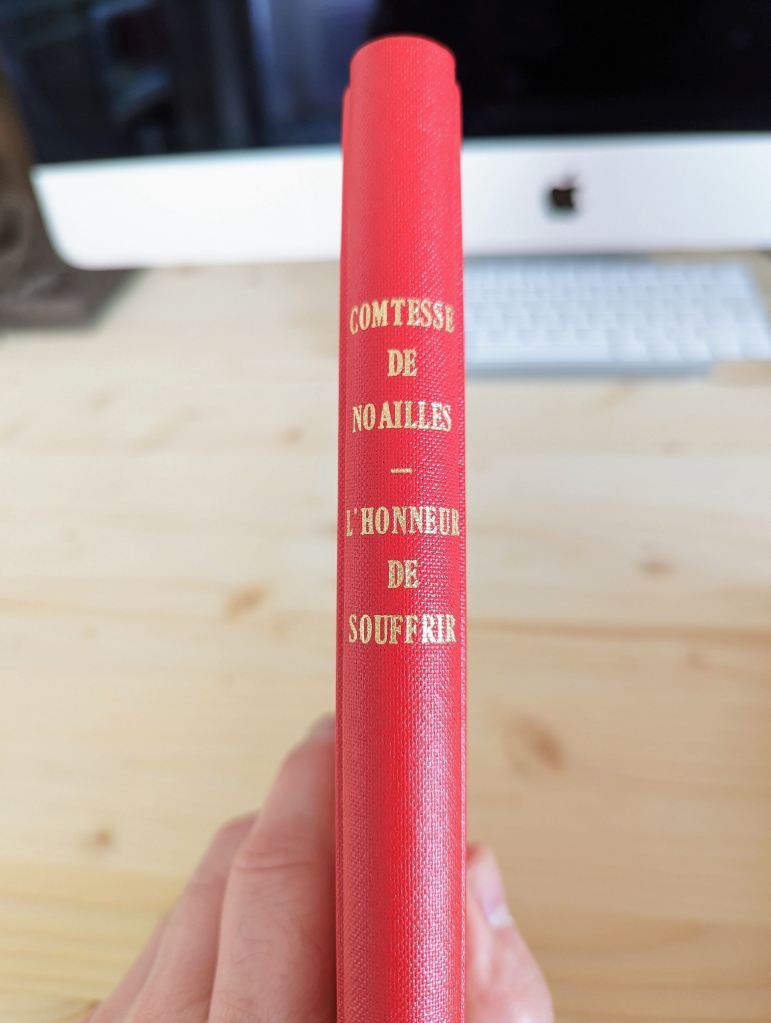 L’honneur de souffrir par la Comtesse de Noailles , Paris, Grasset, Les cahiers verts – 1927.
