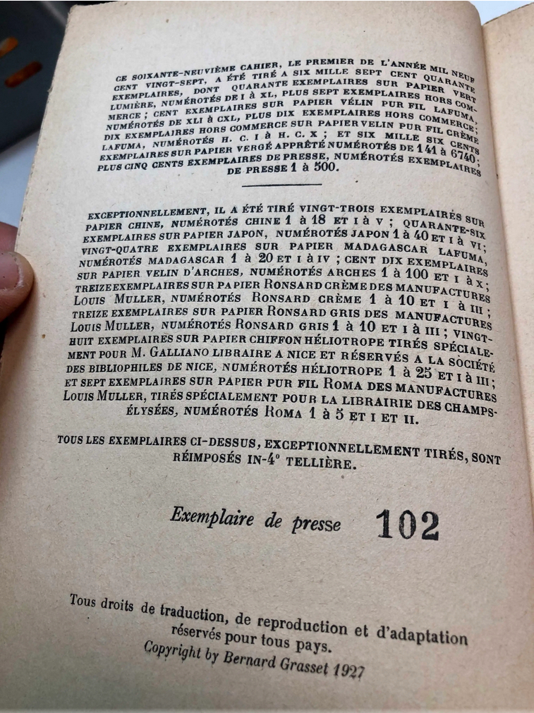 Celui-ci un des exemplaires de Presse sur papier Vergé numéro 102.